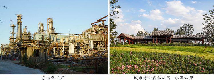 化工厂和城市绿心森林公园对比图。(郭建华摄)