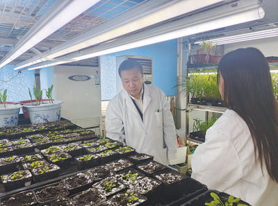 在吉林农业大学实验室,魏健(左)正在和学生观察育种情况。人民日报记者 刘以晴 摄