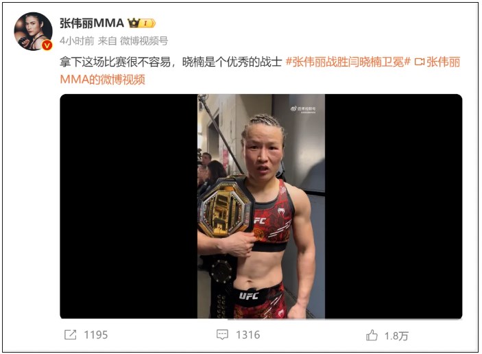 UFC(终极格斗冠军赛)在UFC冠军战历史上首次上演的“中国德比”中,张伟丽与闫晓楠联手奉献了一场极为精彩的比赛。两人打满五个回合,最终张伟丽经一致判定战胜闫晓楠,卫冕女子草量级金腰带。