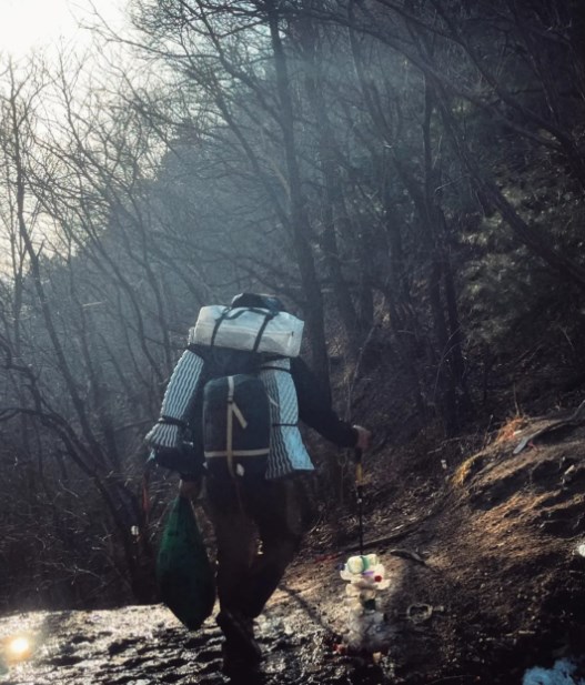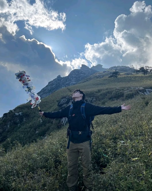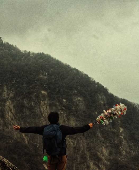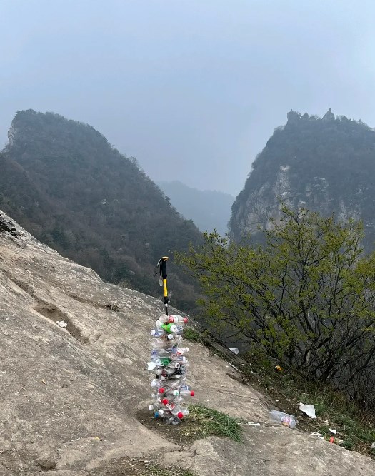 好好的登山杖上,密密麻麻插了几十个塑料瓶、易拉罐……腰间栓的、包上挂的塑料袋里也全是空瓶子,挺帅的小伙子,这是啥造型?到底是来登山,还是捡垃圾的?