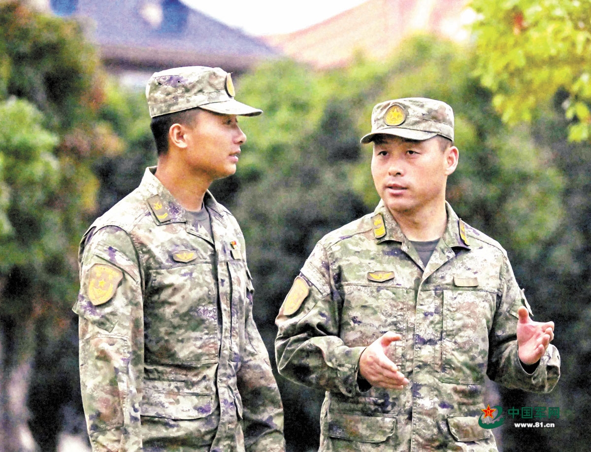 王延龙(右)和战友交流训练心得。陈剑峰 摄