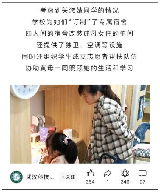 第一次注意到关淑婧的消息,是在四年前。2020年高考,她以562分考进武汉科技大学,考虑到关淑婧行动不便,学校为她“订制”了专属宿舍。