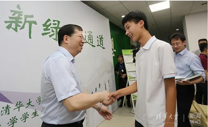 2017年8月,清华大学新生入学,时任校长邱勇与庞众望握手交谈