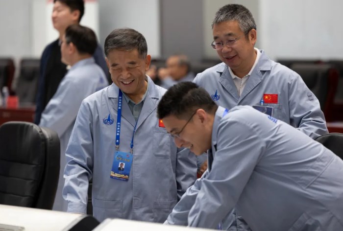 6月4日,在北京航天飞行控制中心,嫦娥六号任务总设计师胡浩(左)、长征五号运载火箭总设计师李东和嫦娥六号任务副总设计师王琼(前)交流嫦娥六号任务进展情况。