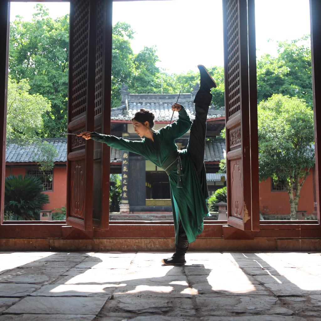 峨眉山市往北约两公里的飞来岗上,坐落着一座依山而建的大庙飞来殿。十来名身着“峨眉青”劲装、手持峨眉剑/刺的妙龄女子步履匆匆,径直推开厚重的朱漆殿门,眼前一殿高过一殿,竟别有洞天。一直抵达最深处的清虚园,这群侠女才散开,各自演练起来,声声娇叱瞬间刺破了青山翠谷、广宇古刹的幽静。剑气纵横,拳拳生风,一招一式似柔实刚,恍如峨眉派重现江湖,又似一幅鲜活的水墨画。