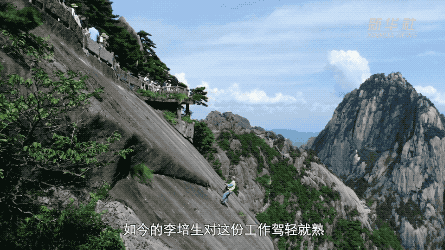 李培生在黄山景区从事环卫保洁工作。他凭借一根绳索,在峭壁上“行走”自如,捡拾掉落的物品。