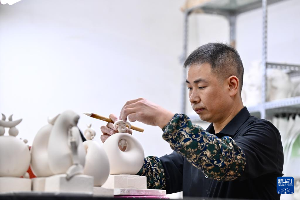 12月6日,彭成雄在位于福建省泉州市德化县的工作室内进行修坯工作。