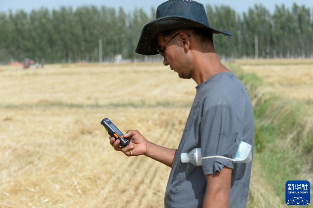 2021年6月19日,麦客阿地力·沙拉木在新疆库车市齐满镇的麦田里操作北斗导航控制器。设置好联合收割机作业路径后,他只需站在一旁观察机械收割情况。新华社记者 高晗 摄