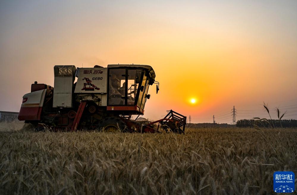 2025年5月28日,在河南省商丘市夏邑县会亭镇张楼村,收割机伴着夕阳在田间收获小麦。 新华社发(王高超 摄)