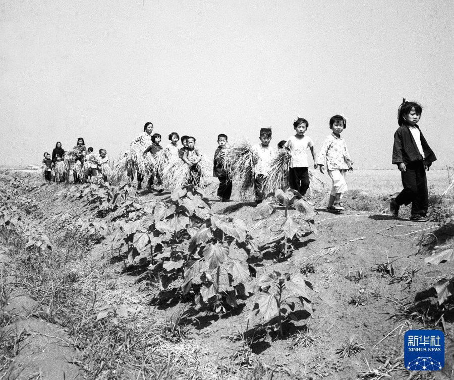 1959年,北京中德友好人民公社的孩子们到田里拾麦穗。新华社发
