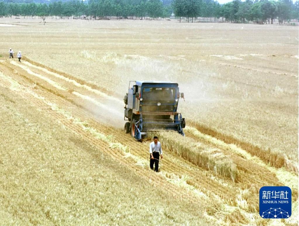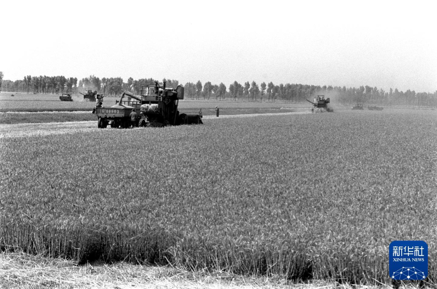 1989年,河南国营黄泛区农场的农工用联合收割机抢收小麦。新华社记者 陆轲 摄