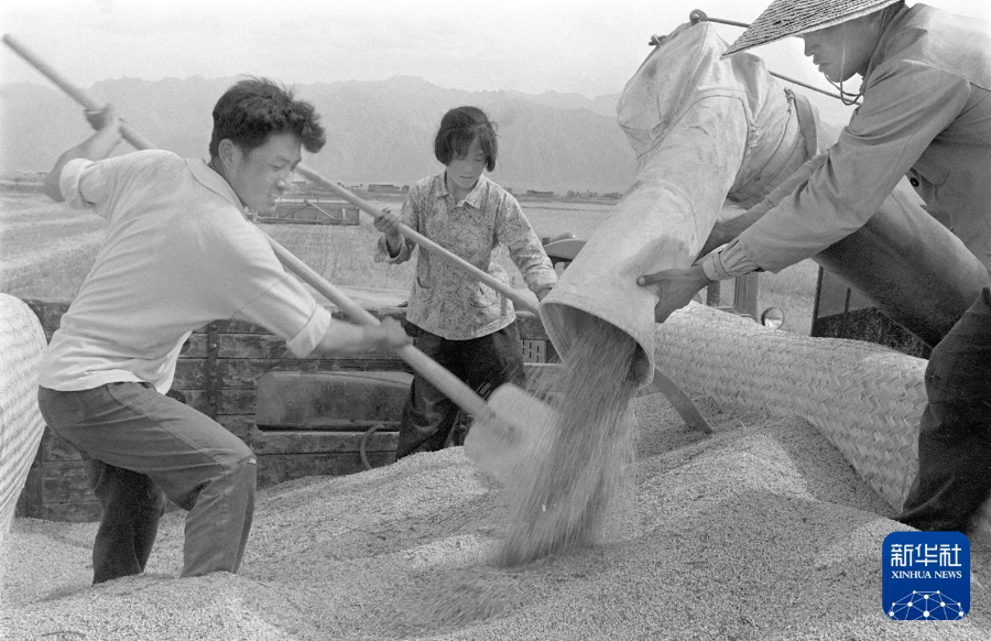 1964年,陕西省国营三门峡库区农场的职工们装运新麦。新华社记者 和坪 摄