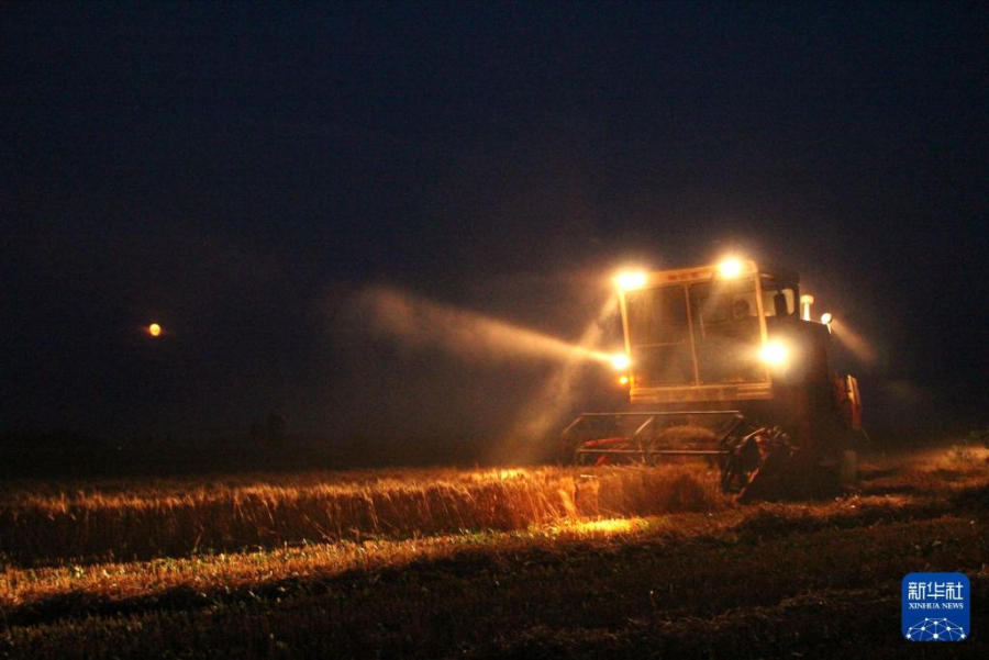 2012年6月4日,河南省内黄县城关镇西长固村村民驾驶收割机在夜间收割小麦。新华社发(刘肖坤 摄)