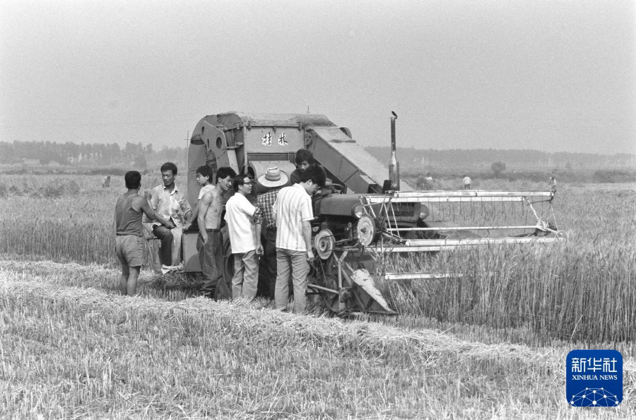 1991年,北京顺义赵古营村的农民在田头看机械麦收。 新华社记者 王呈选 摄