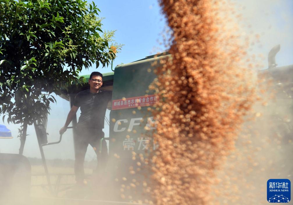 2025年6月5日,在河南省武陟县嘉应观镇吴小营村的一处麦田,村民驾驶农机收获小麦。新华社发(王琳锋摄)