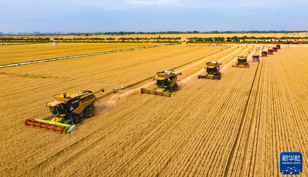 2024年5月29日,在河南省驻马店市西平县老王坡高标准农田,机收编队在收获小麦。新华社发(赵永涛 摄)