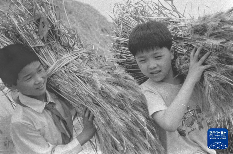 1997年,小朋友们在江苏江浦汤泉乡的打麦场上体验劳作。新华社发(刘小元 摄)