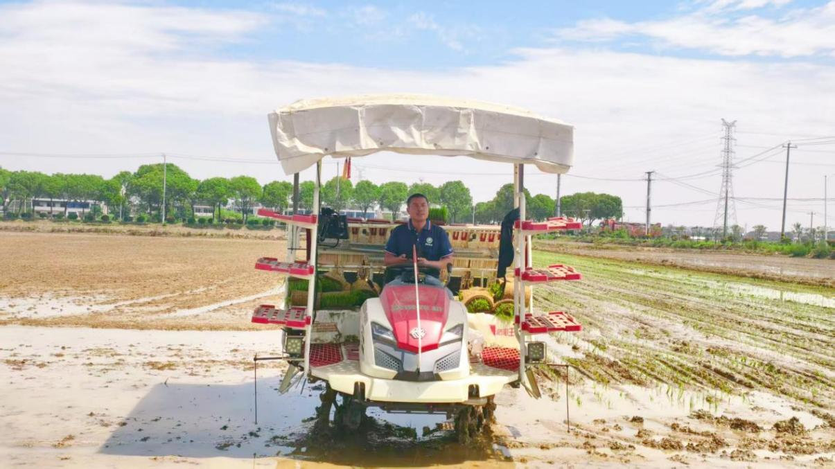 芒种至,农忙始。长江以南,一群群白鹭掠过江苏省无锡江阴市周庄镇的一片片绿田,令人顿起“守拙归园田”之意。不远处,被大家称为“米哥”的新农人程雪峰正驾驶着插秧机在水田里穿梭。只见车轮驶过之处,嫩绿的秧苗整齐列队,他则像一位神器在手、成竹在胸的指挥家,在希望的田野上,奏响乡村振兴的动人乐章。
