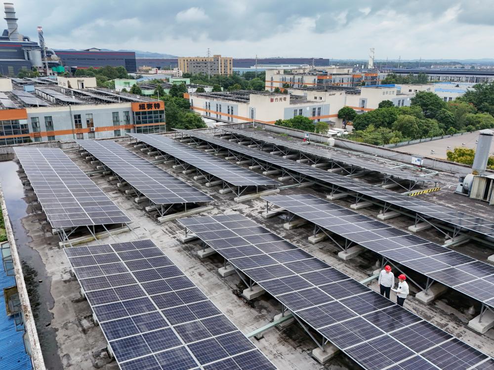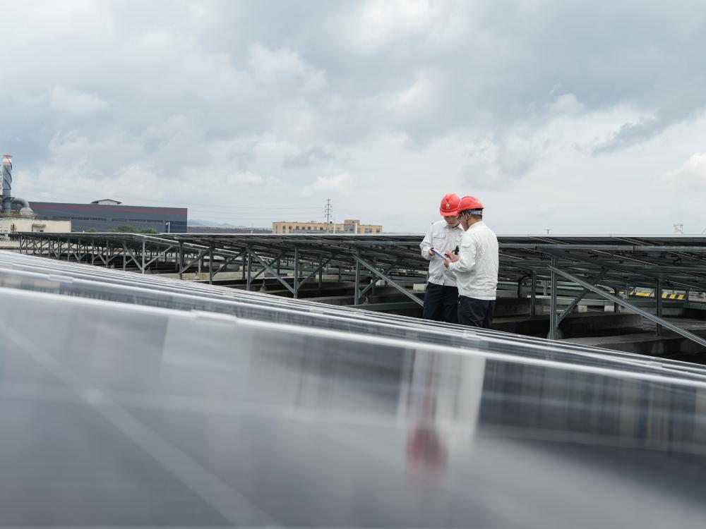 在四川省都江堰市工业园区,朱鹏宇(左)和同事检查工业用户新装屋顶光伏板。
