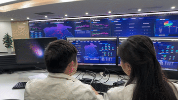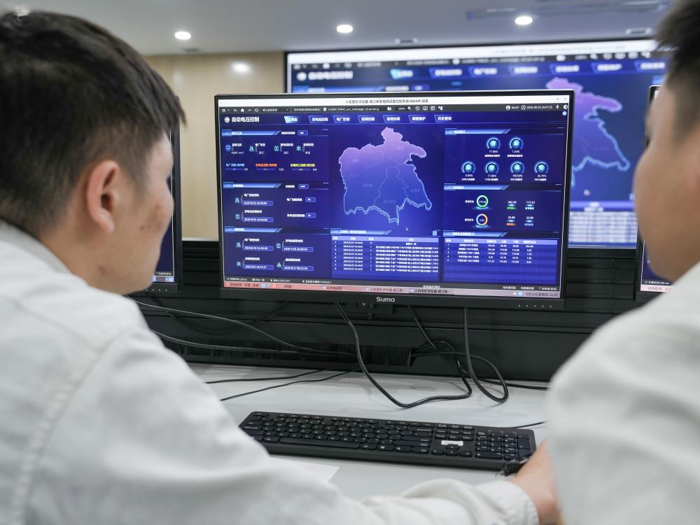 在国网岷江供电公司电力调度控制中心,朱鹏宇(左)和同事查看各变电站电压自动调节功能投入和运行情况。