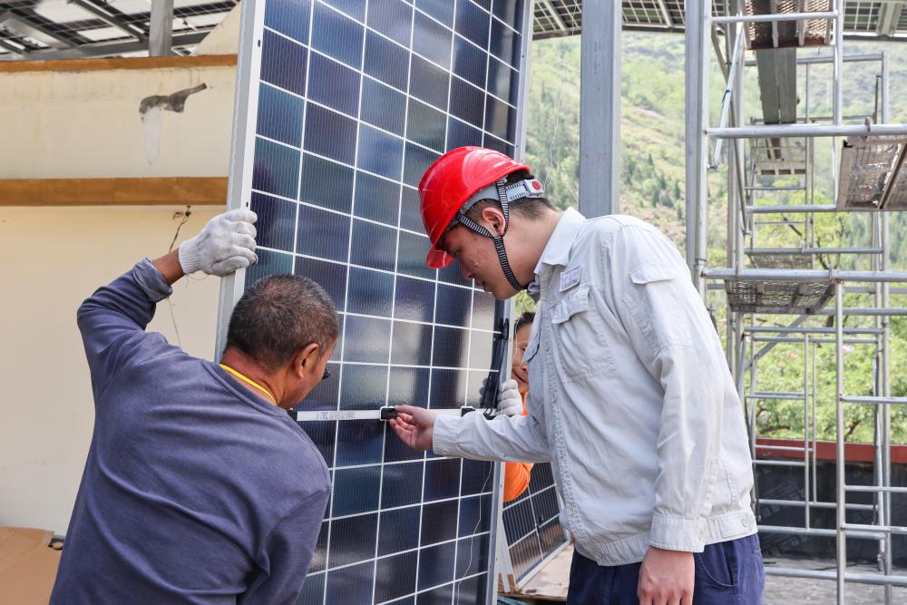 在四川省汶川县威州镇,朱鹏宇(右)在居民用户屋顶光伏安装施工现场对光伏板安装情况检查。