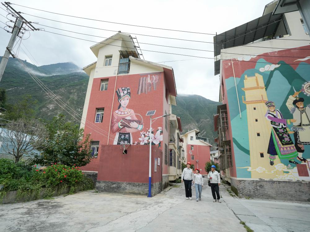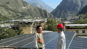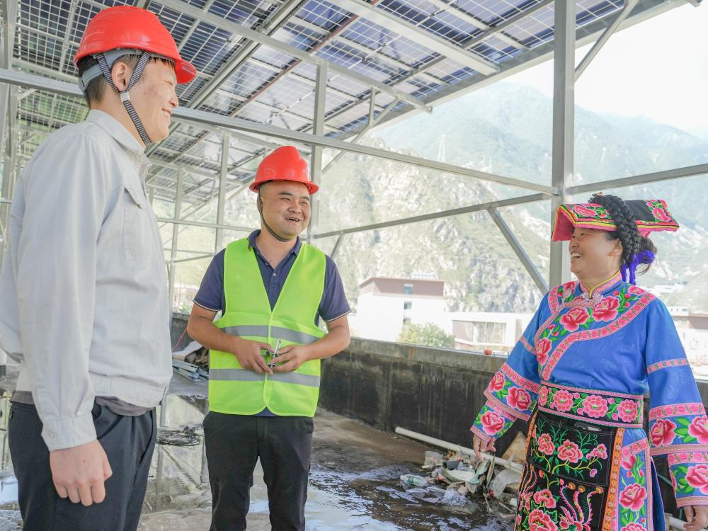 在四川省汶川县威州镇万村,朱鹏宇(右)和村民了解新装屋顶光伏板的情况。