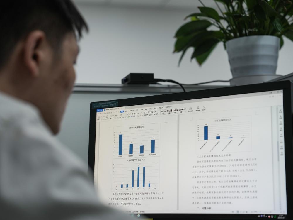 朱鹏宇在办公室编写电力运行分析报告,落实下一步运行改进计划。