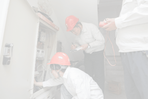 在四川省汶川县威州镇新桥村河坝安置小区,朱鹏宇(左)和同事对居民楼供电设备设施巡视检查。