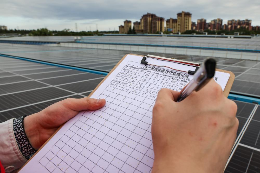 在四川省都江堰市工业园区,朱鹏宇在工业用户屋顶对光伏板运行情况进行例行检查并记录相关数据。