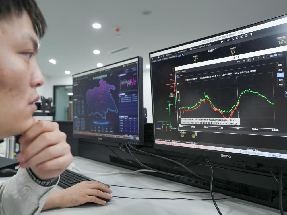 在国网岷江供电公司电力调度控制中心,朱鹏宇和同事对电力系统整体运行情况的各项指标数据进行监测。