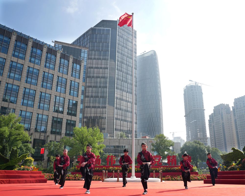 10月1日,在上海中共一大纪念馆前举行的文艺演出中,小朋友在表演舞蹈《男儿当自强》。新华社记者刘颖摄