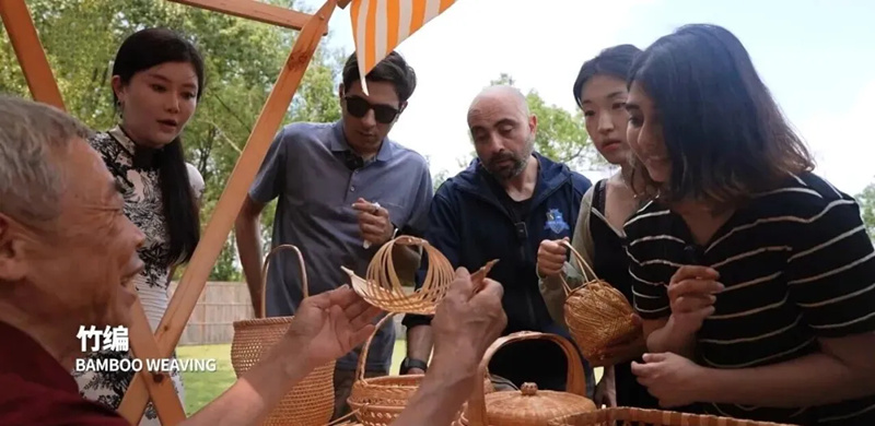 稻穗低垂、锣鼓声声,活动在国家级非遗舞草龙表演中拉开序幕,现场气氛热烈。松江筘布、竹编、叶榭软糕、青龙饺、张泽羊肉等非遗项目在乡村小院一一呈现,让外国友人大饱眼福。在筘布摊位前,工作人员娓娓道来叶榭筘布的悠久历史与名字由来,引得“洋朋友”们兴致盎然。木火慢炖两小时的张泽羊肉香气四溢,让大家赞不绝口。竹编技艺同样引人注目,小蹴鞠、花篮、笔筒、提篮等作品精巧别致,“提篮好可爱;还能用来装米饭,太不可思议了!”外国友人对非遗竹编连连赞叹。