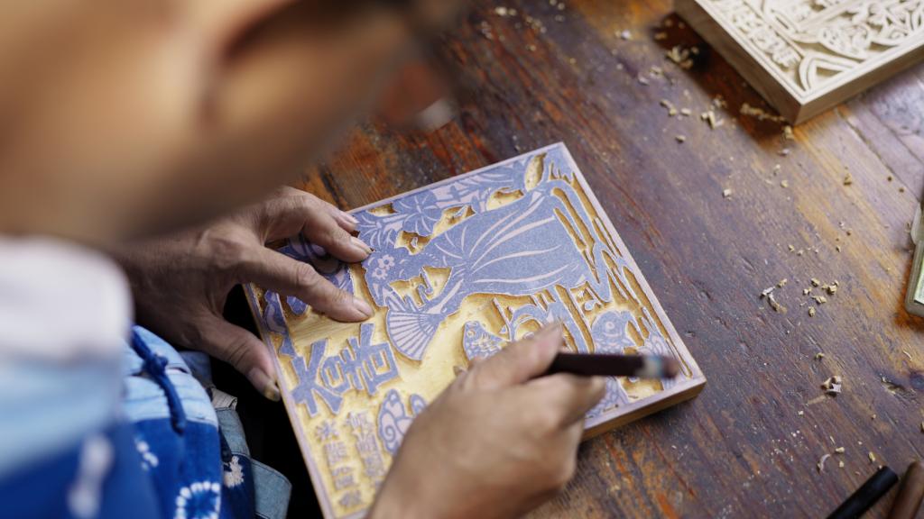 7月5日,喜洲匠志集民艺中心甲马版画艺术馆内,工匠正在雕刻甲马。新华社发(罗晓川摄)