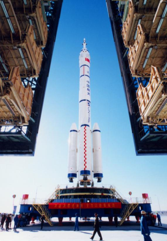 2003年10月15日,我国在酒泉卫星发射中心进行首次载人航天飞行。9时整,神舟五号载人飞船发射升空。新华社记者 李刚 摄