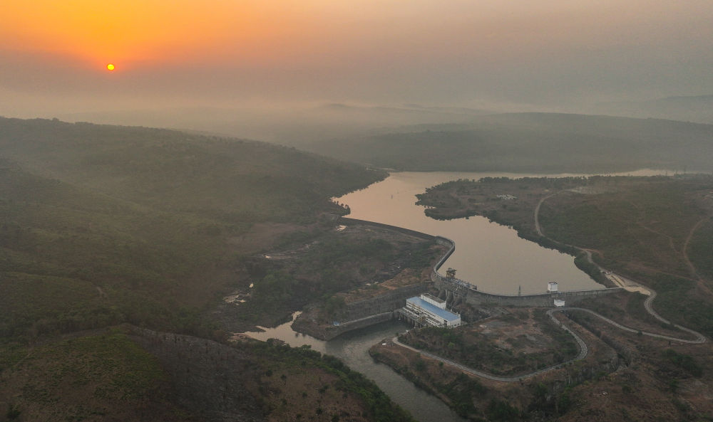 这是2025年4月25日在几内亚杜布雷卡省拍摄的日出时分的凯乐塔水电站(无人机照片)。