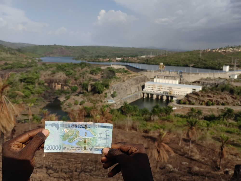 这是2025年5月3日在几内亚杜布雷卡省以凯乐塔水电站为背景拍摄的20000几内亚法郎纸币。
