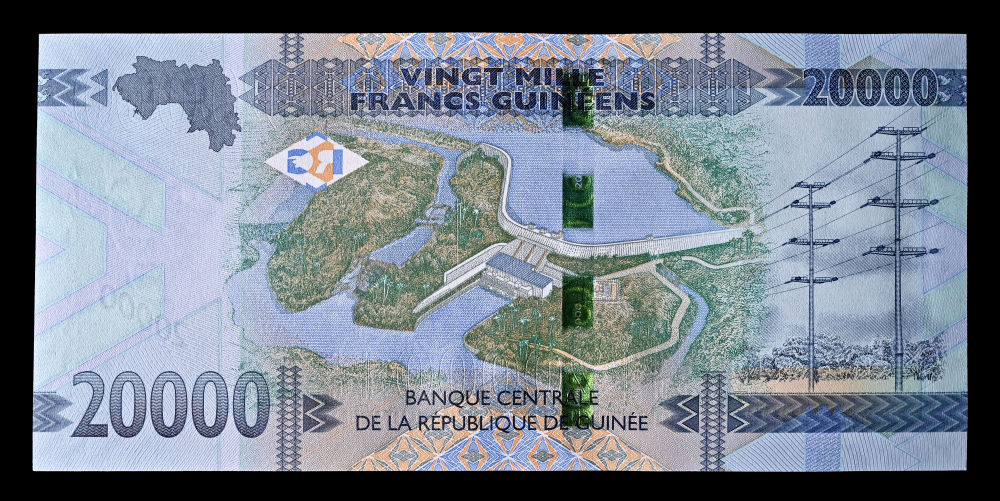 这是印有凯乐塔水电站图案的20000几内亚法郎纸币。