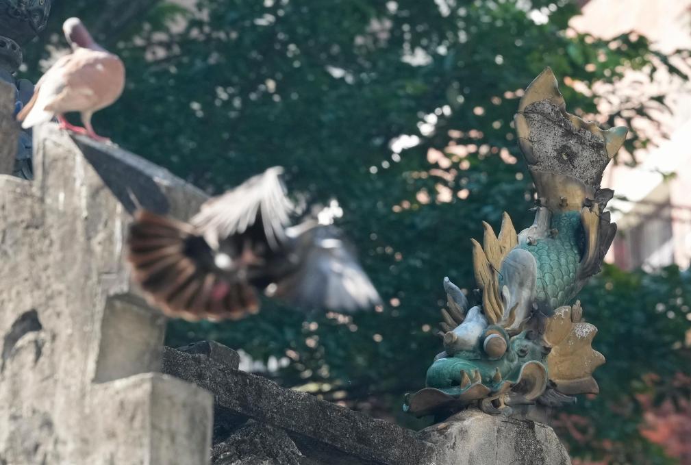 11月12日,在香港的观音庙屋顶上,立着鳌鱼的雕塑。新华社记者 吴鲁 摄