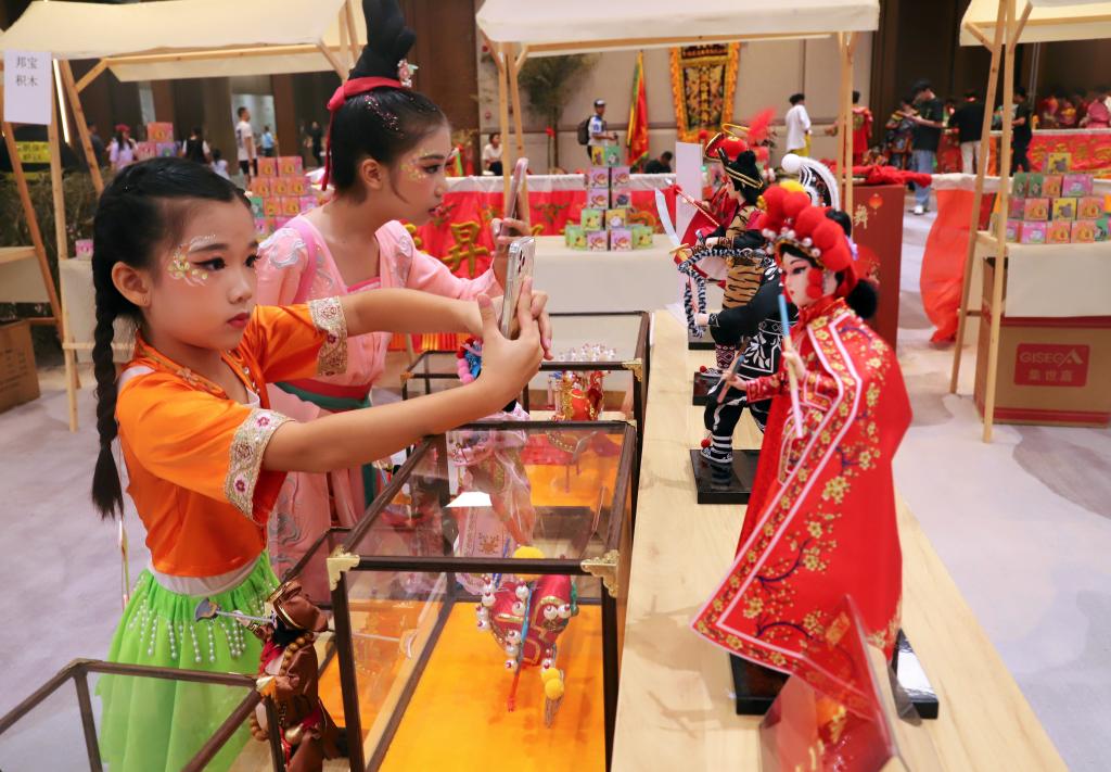 2025年10月3日,在汕头国际会展中心英歌舞非遗展示区,观众拍摄英歌舞主题潮绣挂件、泥塑摆件等工艺品。