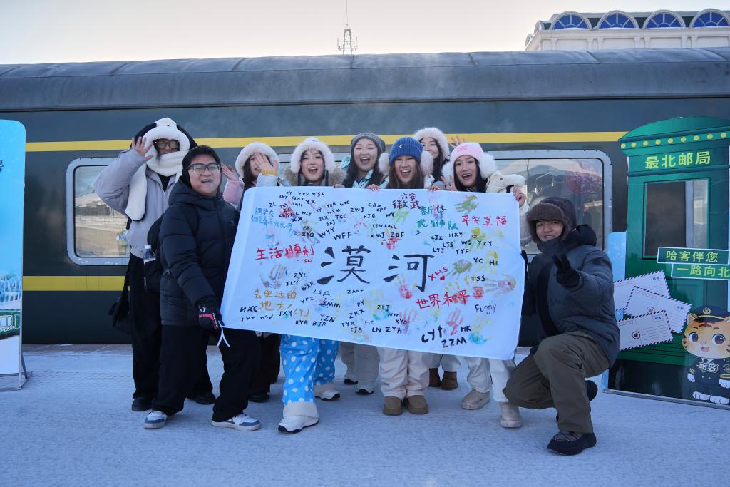 2026年1月27日,游客在漠河站展示手绘画作。冰窗花、林海雪原……连日来,坐上由哈尔滨站开往漠河站的K7039次“雪国列车”,来自天南海北的游客把冬日限定美景尽收眼底,沉浸式体验北国风光。新华社记者 王祚 摄