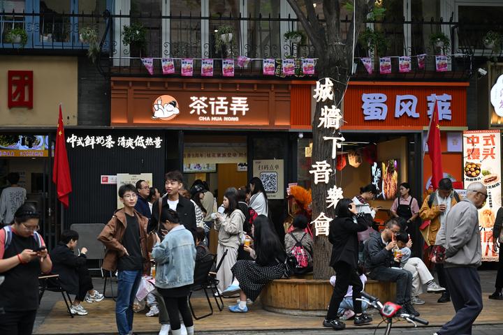 2025年10月3日,游客在西安城墙建国门至东南城角段的老菜场创意街区游玩。 新华社记者 李一博 摄