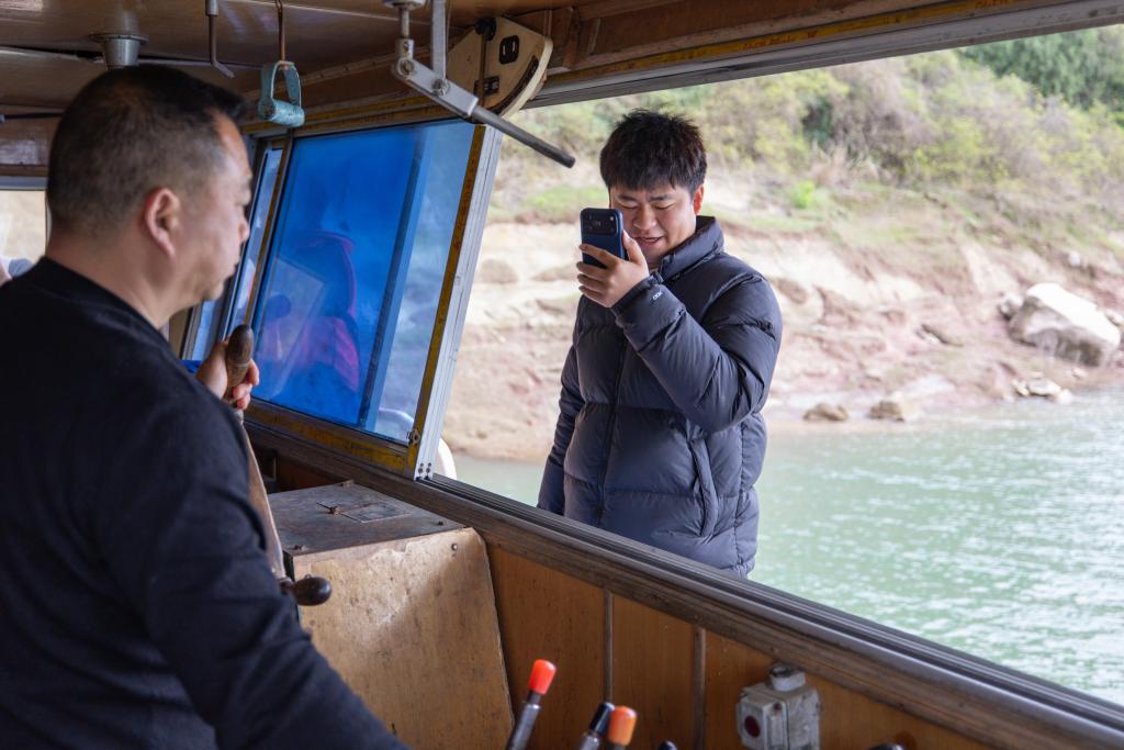 3月30日,秦源泽(右)在“渝忠客2180”客船上通过网络平台进行直播。