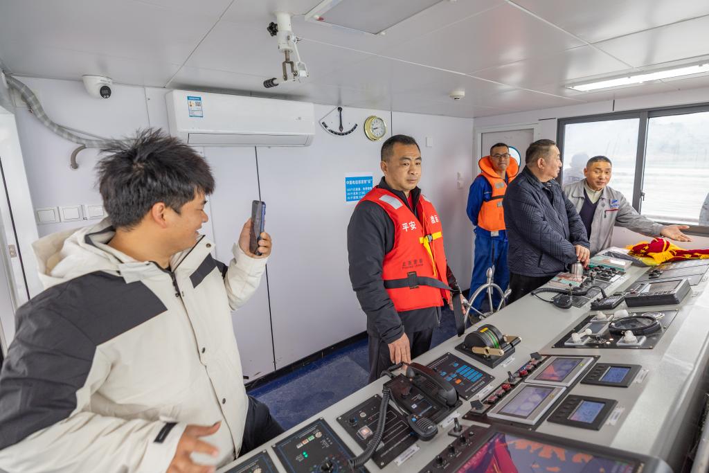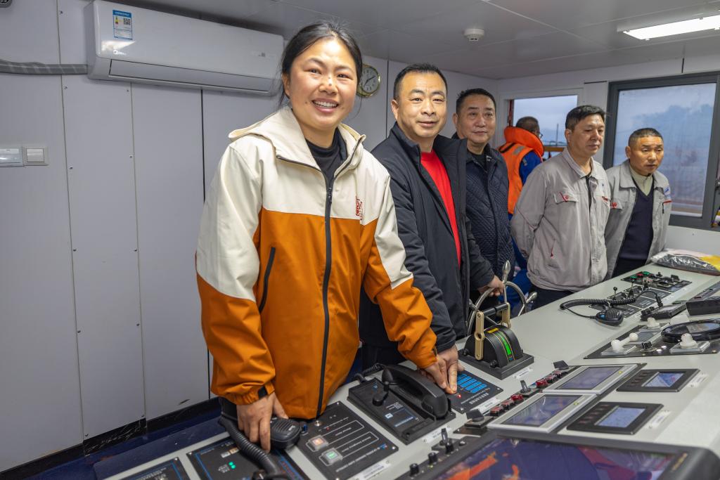 3月31日清晨,秦大益(左二)与合伙人曹利芳(左一)共同按响“新渝忠客2180”客轮的首航汽笛。