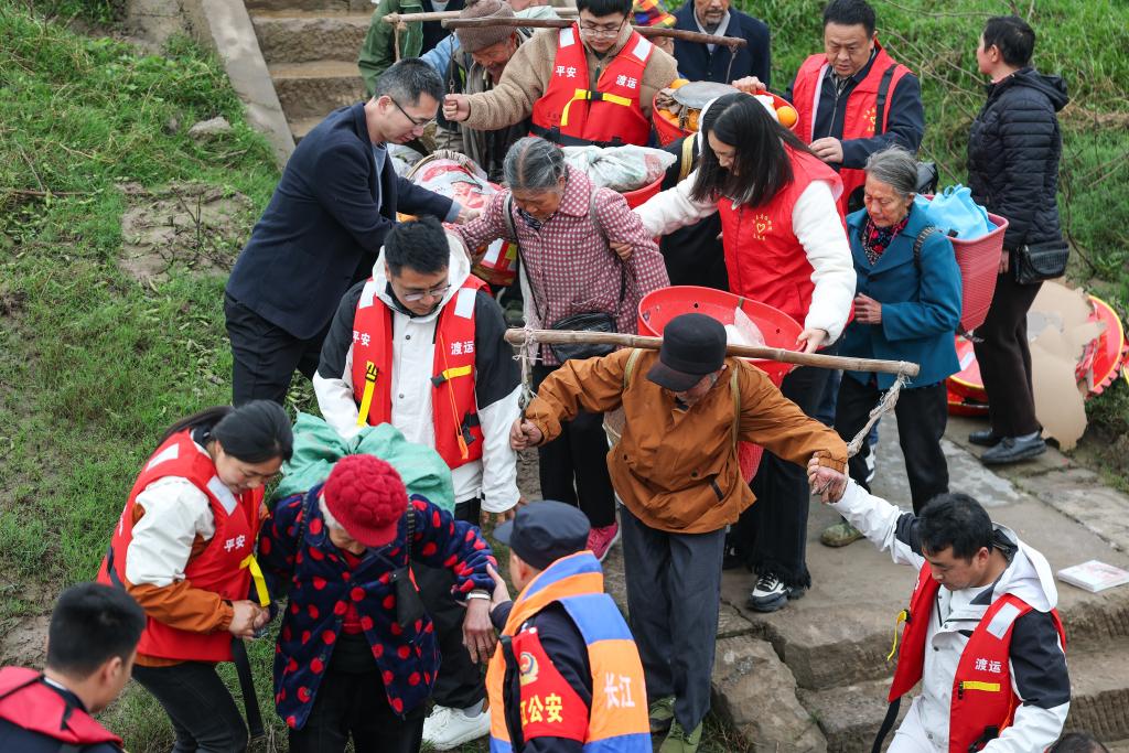 3月31日,菜农在志愿者的帮助下登上“新渝忠客2180”客轮。