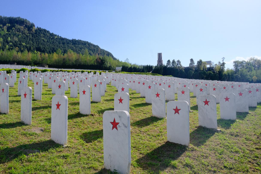 翻越连绵群山,驶出隧道时,豁然光亮。清明时节,大巴山云雾缭绕,只见漫山遍野的红星闪耀其中。四川通江,川陕革命根据地红军烈士陵园。这里是全国安葬红军烈士最多、规模最大的红军烈士陵园。