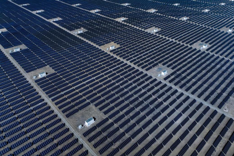青海省海南藏族自治州共和县塔拉滩,数百万张光伏板渐次铺展,组成全球装机容量最大的光伏发电园区。
