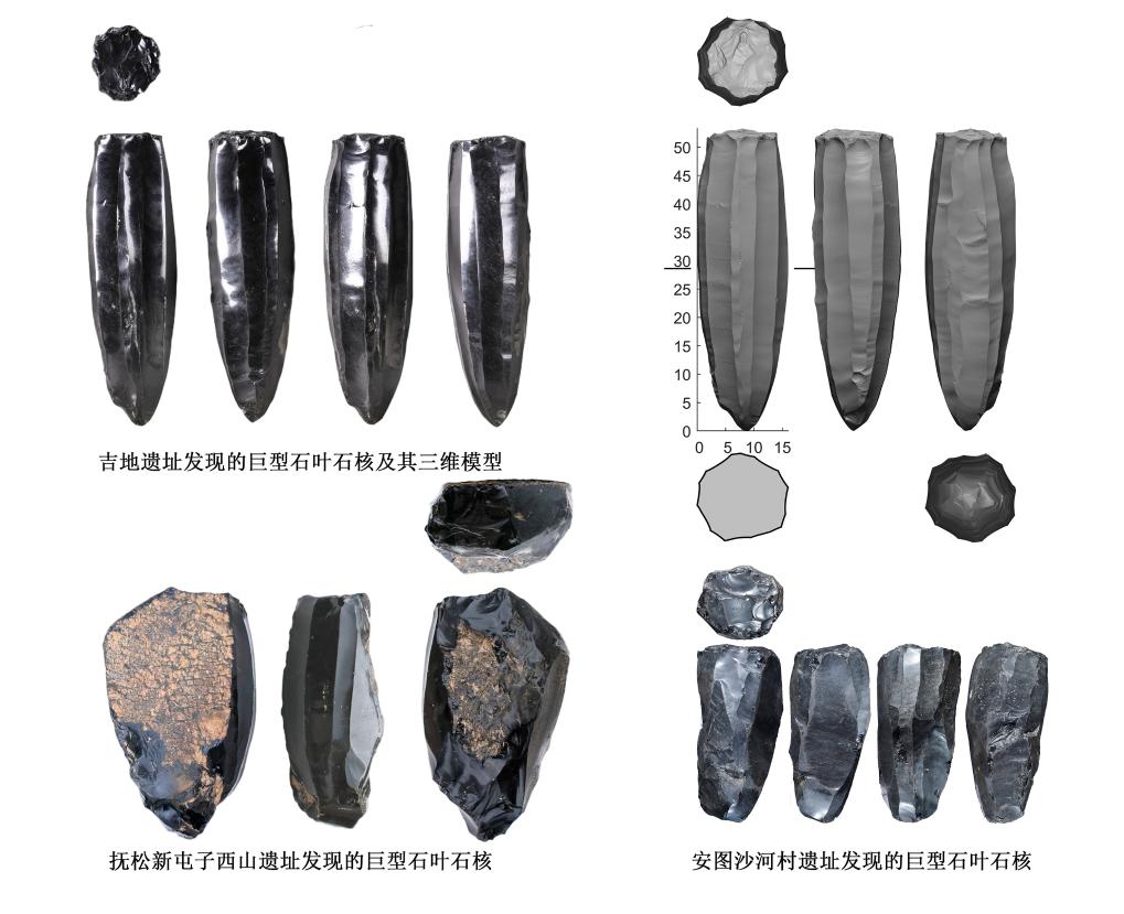 吉林长白山地区发现的巨型石叶石核(拼版照片)。新华社发