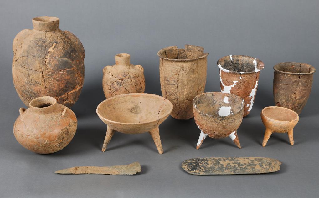 河南新郑裴李岗遗址西部墓葬区M85出土的器物组合(资料照片)。新华社发