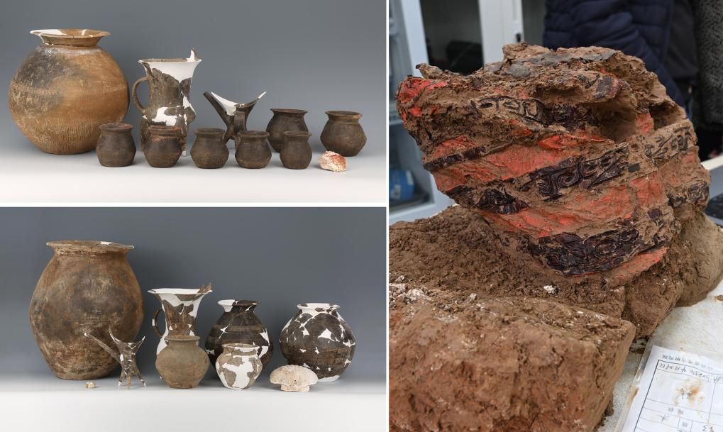 拼版照片:左上为山西昔阳钟村遗址墓葬M10出土器物组合,左下为山西昔阳钟村遗址墓葬M13出土器物组合,右为山西昔阳钟村遗址出土的漆器(资料照片)。新华社发