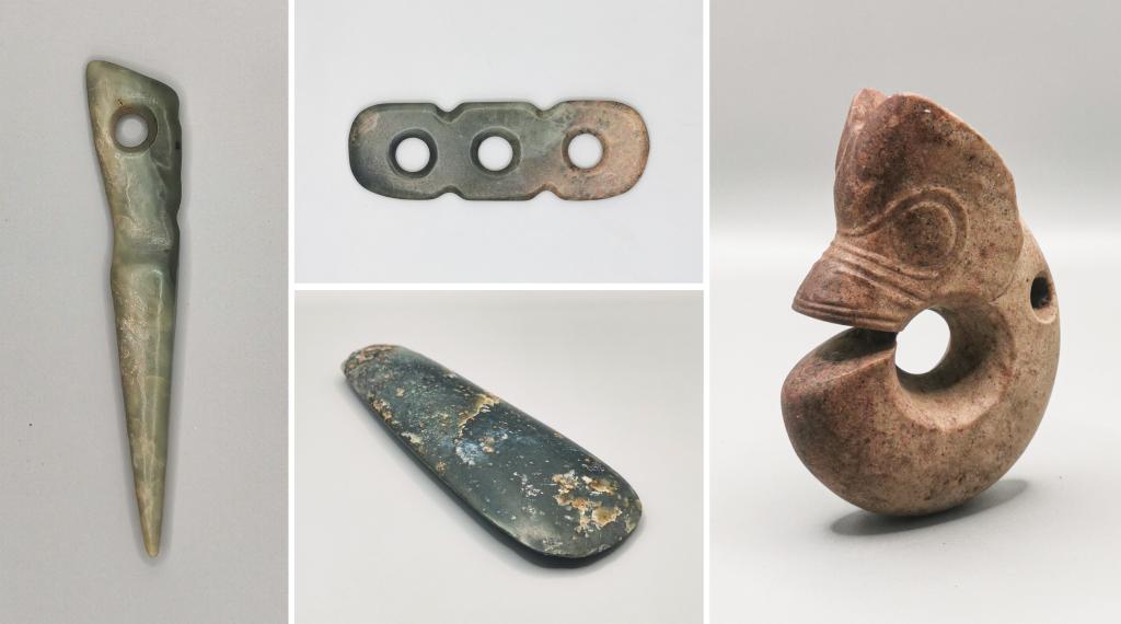 拼版照片:河北宣化郑家沟遗址1号积石冢出土的部分玉器(资料照片)。新华社发